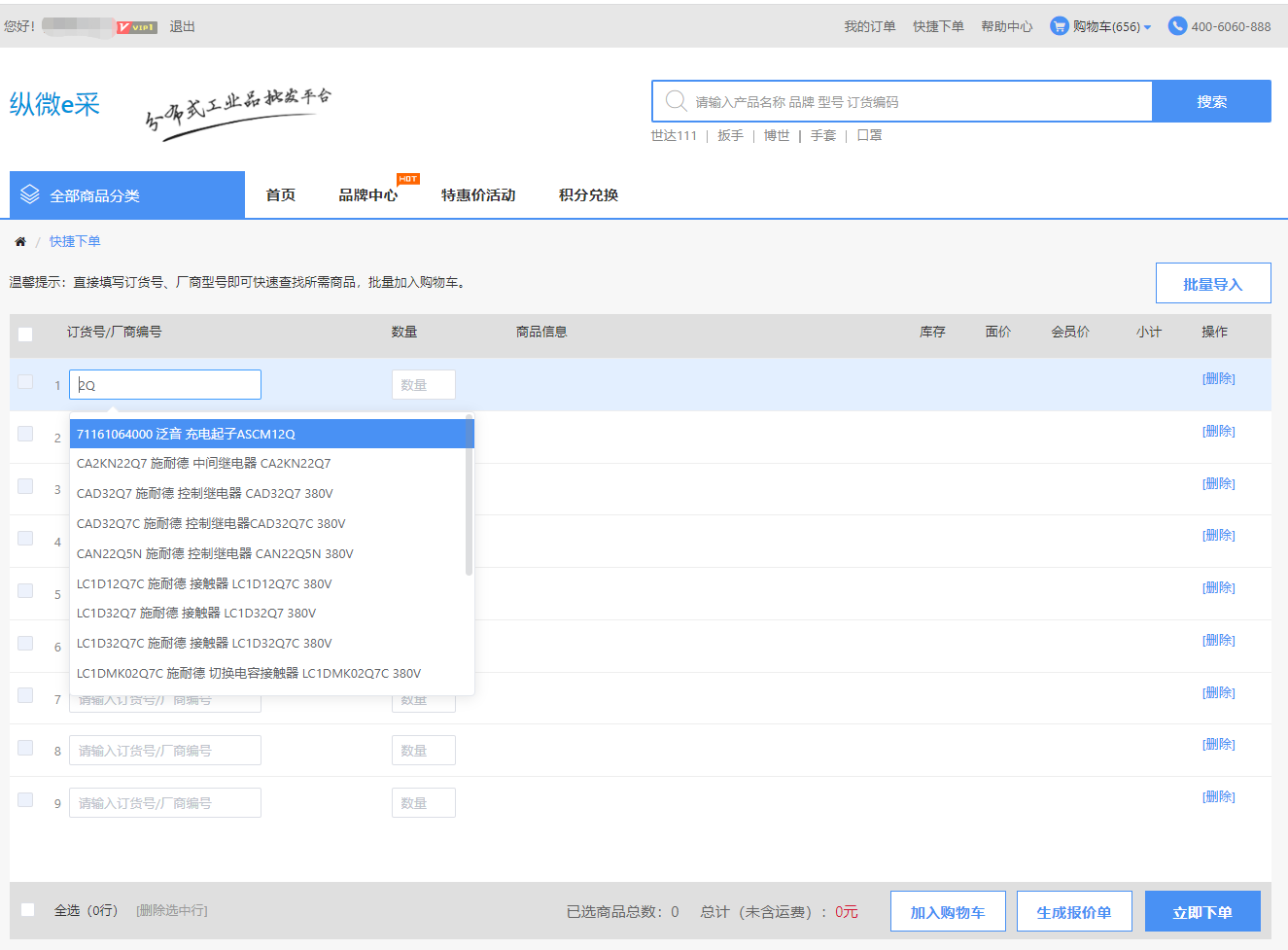 4.在快捷下单内输入商品的订货号/厂商编码下单。