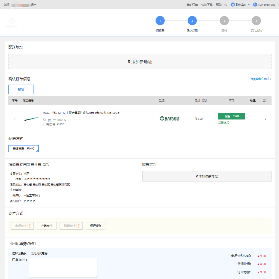 完善收货地址、支付方式、发票信息等信息完成提交订单。